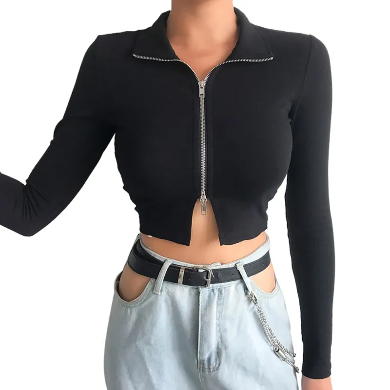 Women New Chic Lapel Long Sleeve Autumn Women Jacket Sexy Slim Black Metal Zipper Closure Crop Card